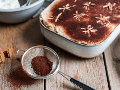 Ook voor het dessert kiezen we voor echte najaarssmaken: gepocheerde peertjes met saffraan, notencrumble en notenijs. De saffraan waarin de peertjes gepocheerd worden, geeft dit dessert een luxueuze touch. Tiramisu geef je dan weer een winterse twist met de speculaaskruiden.
