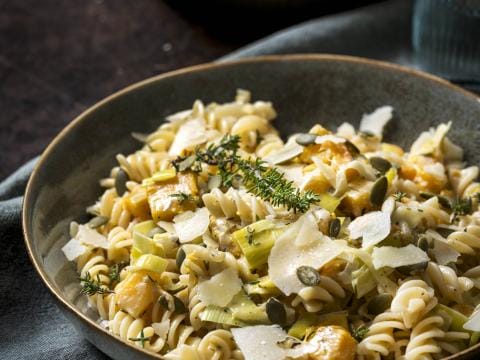 Dinsdag: spirelli met pompoen, prei en kruidenkaas