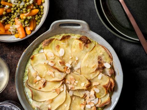 Zondag: vis onder aardappelkorst met erwtjes en wortelen