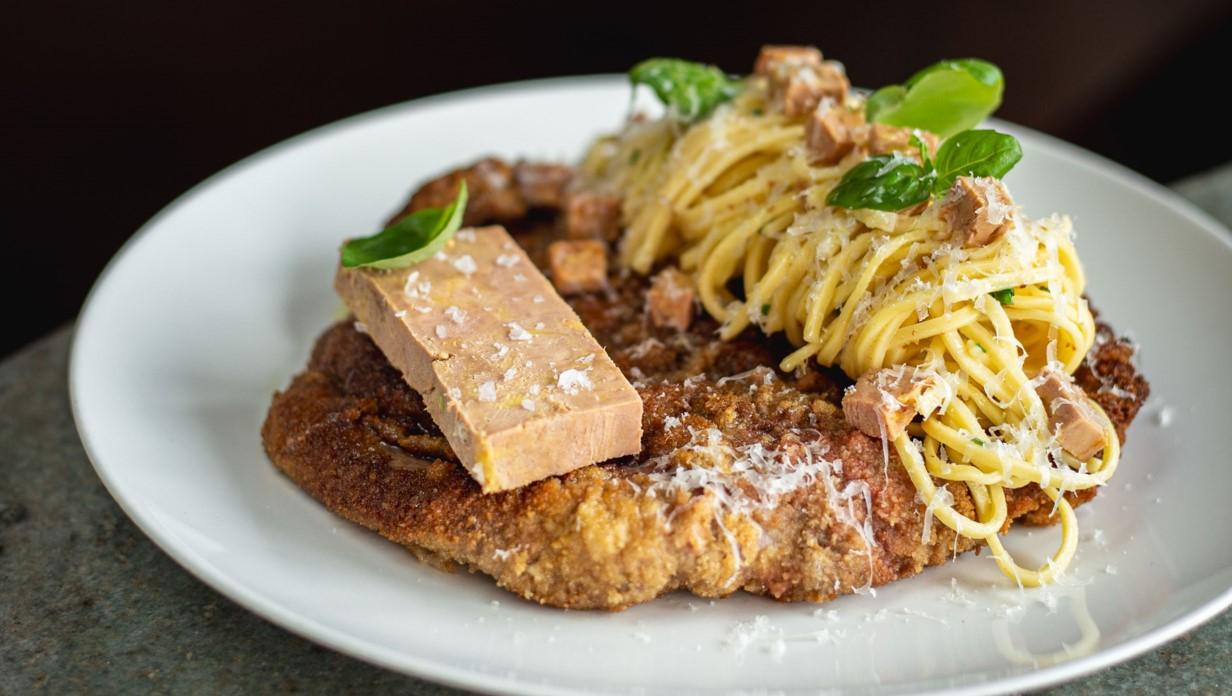 10. Draai de pasta op een bord, leg de schnitzel erbij en werk af met geraspte Foie Gras.