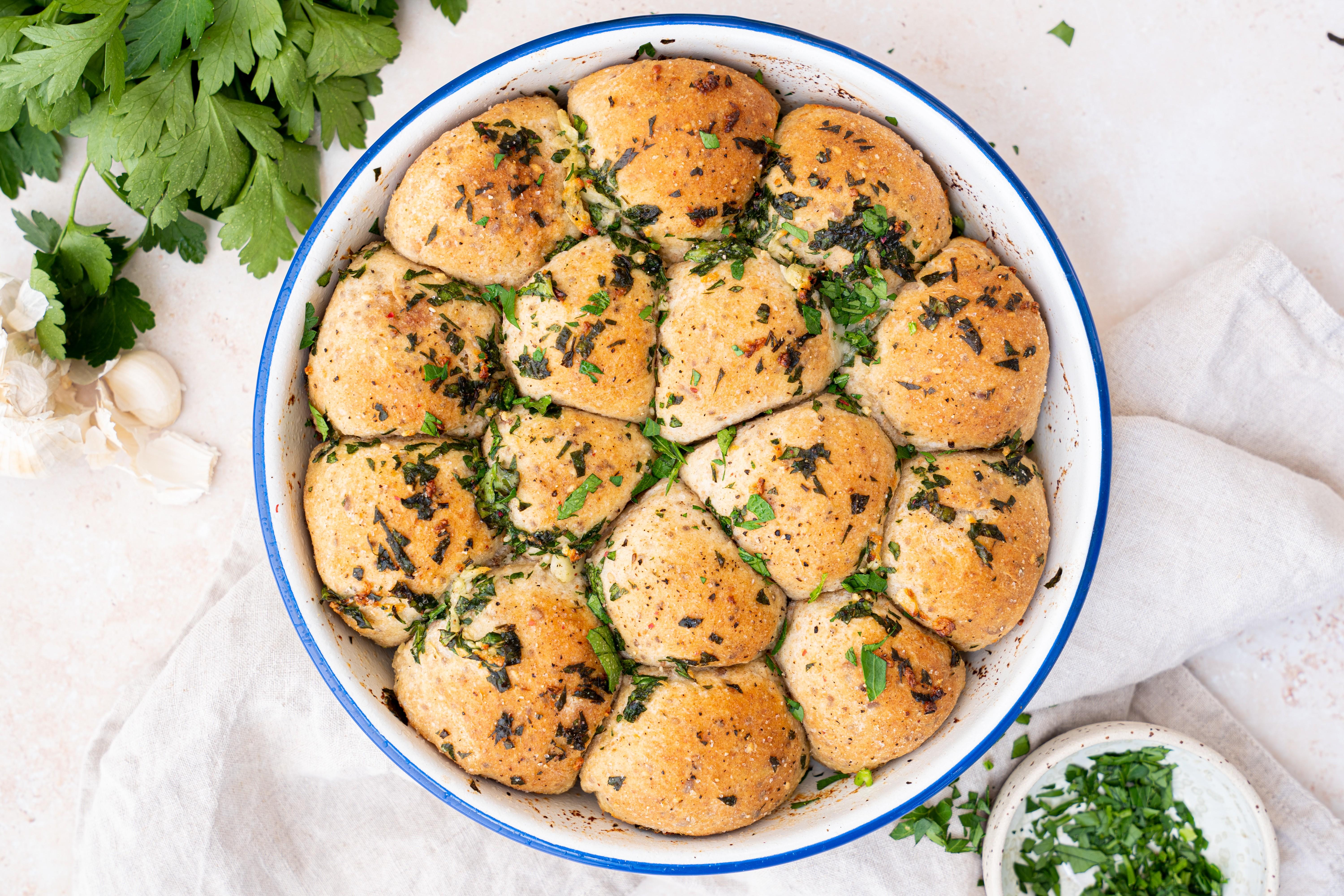 - Meng de gesmolten boter, platte peterselie en knoflook. Bestrijk er de bolletjes mee. Werk af met peper en zout.