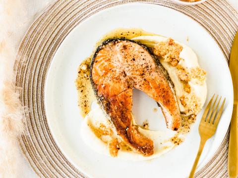Ook knolselder is een smaakbom die nauwelijks iets nodig heeft om te schitteren. In plakken geroosterd of verwerkt in puree zoals bij deze zalmmoot met knolselderpuree, hazelnootboter en parmezaancrumble.