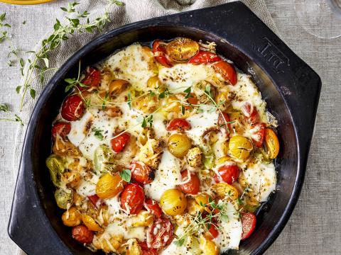 Vrienden op bezoek? Maak eens zelf gnocchi van deze zoetste der patatjes. Met deze gegratineerde gnocchi met mozzarella en gekaramelliseerde kerstomaatjes maak je extra vrienden.