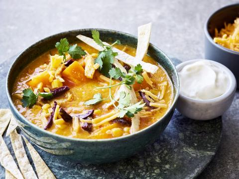 De neiging om overal soep van te maken, breidde zich al snel uit naar de zoete aardappel. Deze zoete-aardappelsoep met kip en maïs is een knipoog naar de oorsprong van de bataat, zeker met de tortillareepjes in plaats van klassieke croutons.