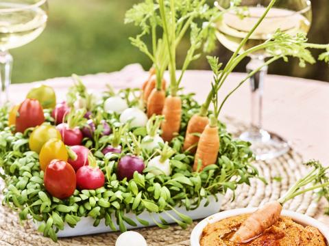 Hummus van zoete aardappel is onze favoriete hummus. Probeer daarom dit originele hapje; groentetuintje met hummus van zoete aardappel.