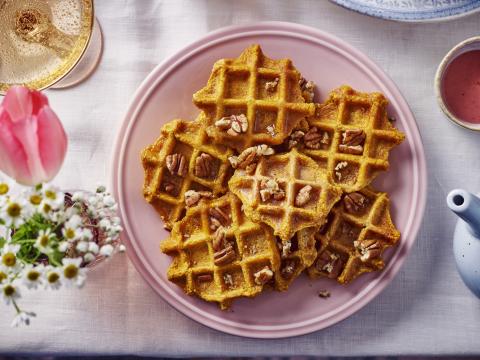 Begin je dag goed: met deze wafeltjes van zoete aardappel met pecannoten neem je een vliegende start.