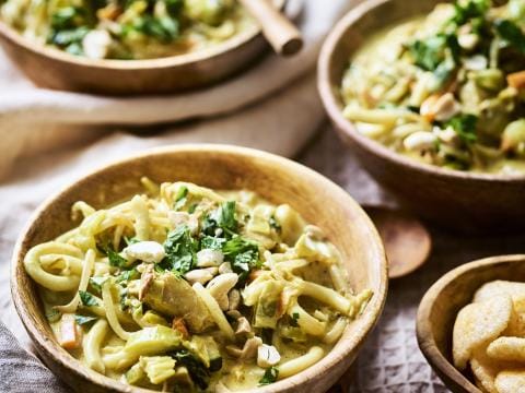 Donderdag: curry met udonnoedels, paksoi en vegan kipstuckjes
