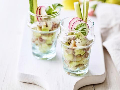 Zilte smaken en komkommer zijn een topcombinatie. Gerookte forel, maatjes krijgen extra frisheid door knapperige komkommer.