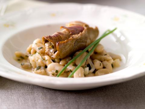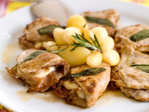 Saltimbocca betekent letterlijk: 'springt in de mond', omdat het zo smakelijk en mals is. De weinige ingrediënten die je ervoor nodig hebt, passen wonderwel bij elkaar: het zachte, malse kalfsvlees, de zoute ham en de aromatische, geurige salie vormen meer dan de som van de delen. Het pakketje wordt gebakken in boter en geblust met witte wijn.