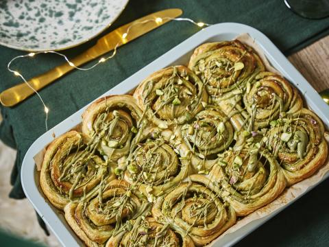 Snij een spie uit de briochebroodjes en rooster de broodjes kort in een grillpan. Vul ze met de scampisalade en werk ze af met een plukje koriander.