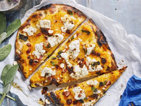 Snelle pinsa met rucolapesto, ricotta, mozzarella en pancetta