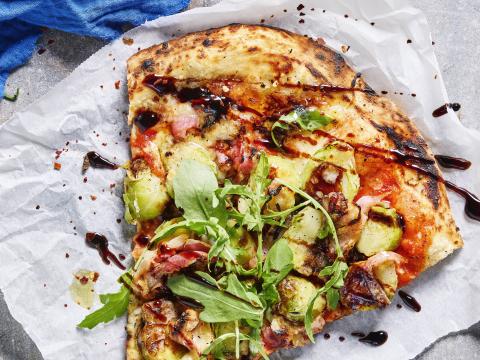 Rol de pizzabodems uit en bestrijk ze met knolseldercrème. Leg er plakjes gerookte eendenborst op en bak de pizza’s 7 à 8 minuten in de oven.