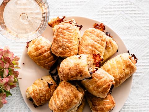 Worstenbroodjes met champignons en kikkererwten