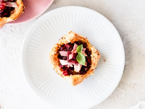 Verwarm de oven voor op 190°C. Steek 8 rondjes van ongeveer 7 cm diameter uit het bladerdeeg. Bekleed er ingevette cupcakevormpjes mee, leg er een stukje bakpapier in en vul de vormpjes met bakbonen. Bak de deegrondjes 10 minuten blind in de oven. Verwijder daarna het bakpapier en de bakbonen, bestrijk het deeg met de losgeklopte eidooier en bak ze opnieuw 8 à 10 minuten in de oven.