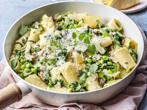 Pasta met spinazieroomsaus en erwtjes