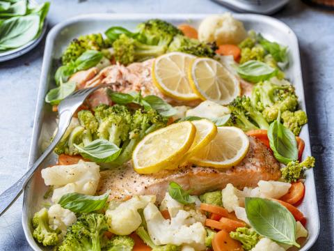 Traybake met zalm en groentemix