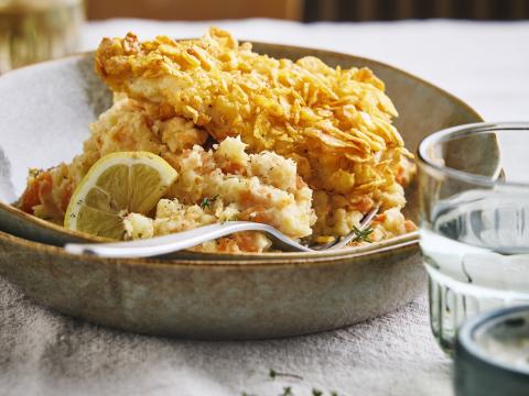 Wortelstoemp met krokante vis uit de airfryer
