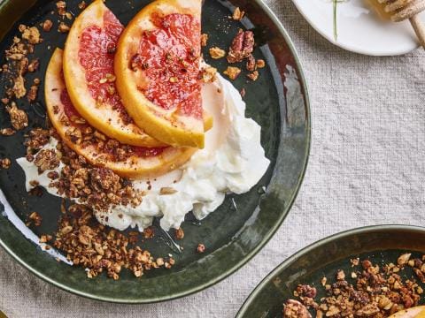 Gegrilde pompelmoes met yoghurt en pecannotengranola