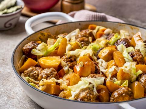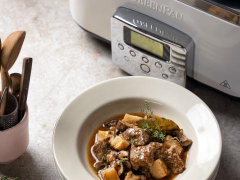 Varkensstoofpotje met kweepeer, krieltjes en cider