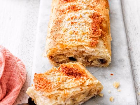 Quiche van filodeeg, zoete aardappel, feta en za’atar