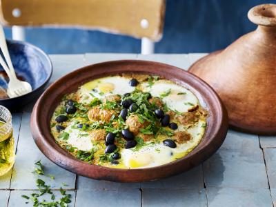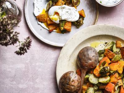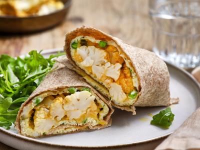 Wraps met een kruidige omelet, geroosterde bloemkool en pompoenhummus