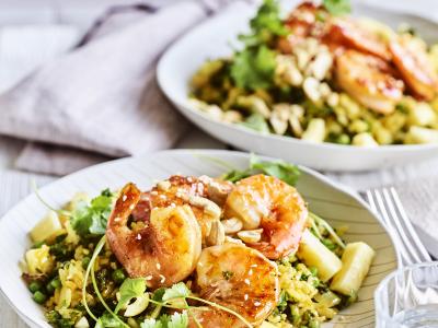 Gebakken gele rijst met verse ananas, boerenkool en scampi’s