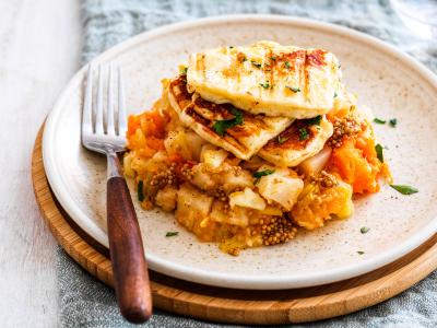 Stoemp van wintergroenten met gepoft mosterdzaad en gegrilde halloumi