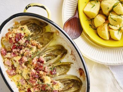 Gevuld witloof met rauwe ham, oude kaas, tijm en gebakken aardappelen