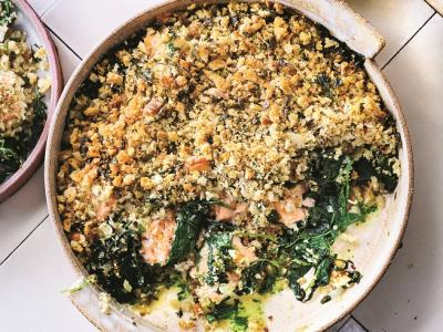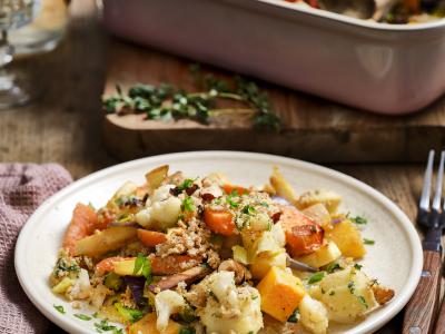 Zelfgemaakte cordon bleu met parelcouscous en geroosterde wintergroenten