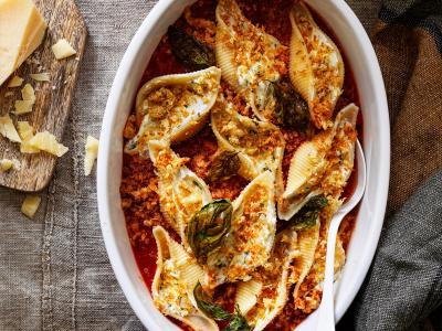 Gevulde pastaschelpen in tomaat-paprikasaus met kruidenkaas en pangrattato
