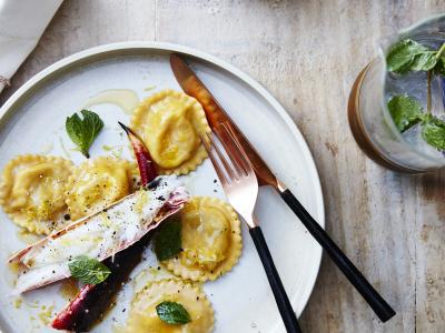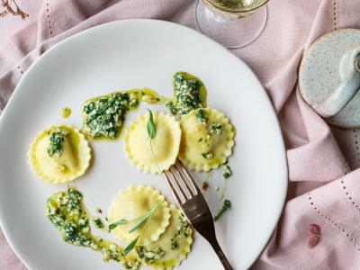 Ravioli met pesto van walnoten, salie en blauwe kaas