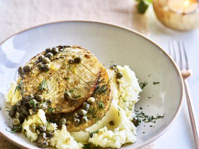 Aardappelpuree met knolseldersteak en kappertjessaus