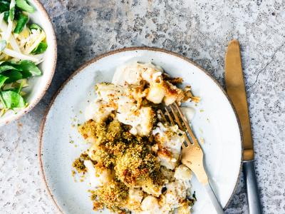 Pastinaak-knolselderstoemp met zwarte pens en peperkoekcrumble
