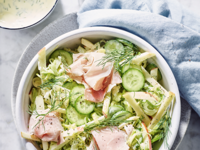 Salade van jonge prei met appel en ­hamroosjes