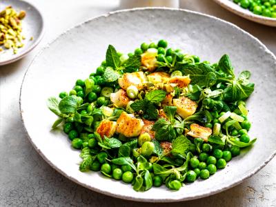 Erwtensalade met halloumi, ­pistachenoten en mosterddressing