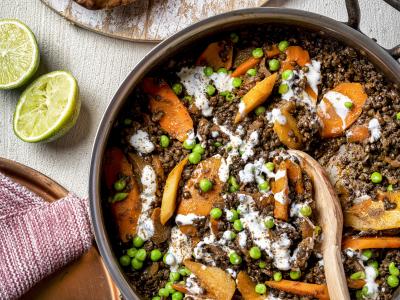 Zoete-aardappelpuree met groenteballetjes en mosterdsaus