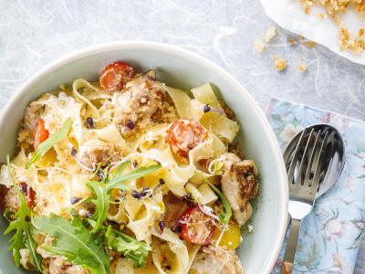 Pappardelle met konijn, ricotta en kerstomaatjes