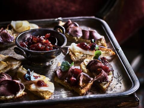 Bruschetta met veenbessenchutney, slowroast koolrabi en gebakken eend