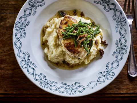Gebakken vis met bloemkoolpuree met oude kaas en eekhoorntjesbroodboter