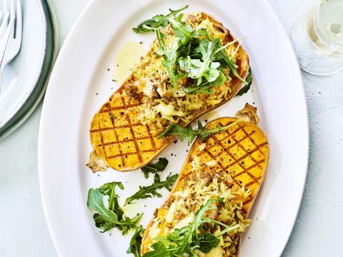 Pasta-pompoenschotel met pompoensaus en pancetta