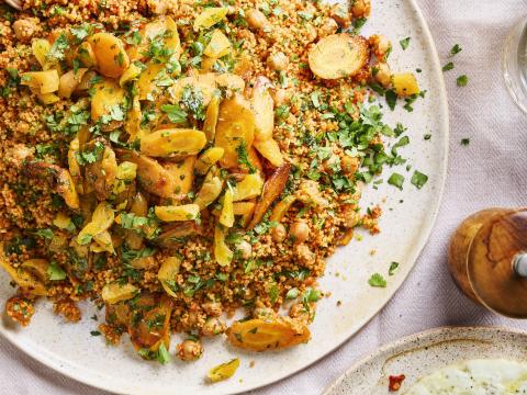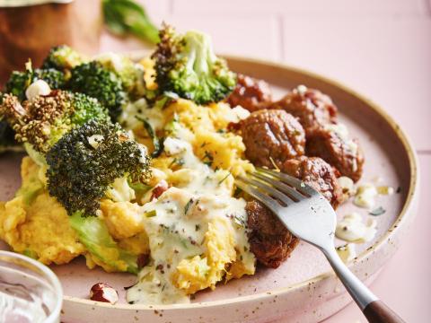Zoete-aardappelpuree met groenteballetjes en mosterdsaus