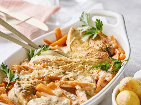 Kipstoofpotje met pommes duchesse en witloofslaatje