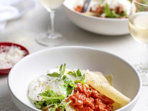 Rigatoni met ragout van bospaddenstoelen en varkensworst