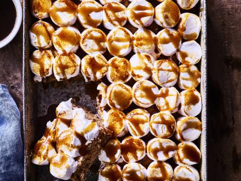 Carrot cake-plaattaart met marshmallows en gezouten karamel