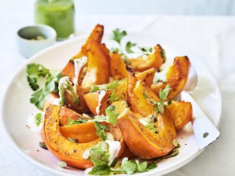 Geroosterde pompoenwedges met citroenyoghurt en korianderpesto