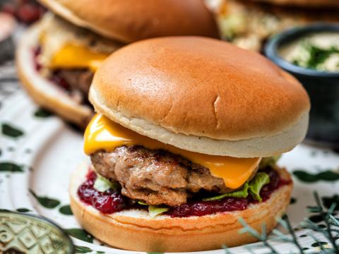 Kalkoenburger op een briochebroodje met veenbessencompote