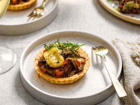 Hartige tartelettes met champignons, zoete aardappel en kaas