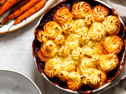 Hachis parmentier met eend en geroosterde worteltjes
