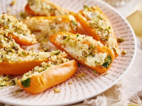 Gevulde minipuntpaprika’s met geitenkaas en krokant pistachekorstje