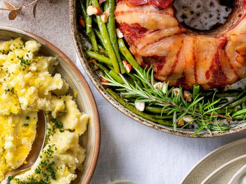 Gehaktbroodkrans met citroenpuree en krokante prinsessenboontjes